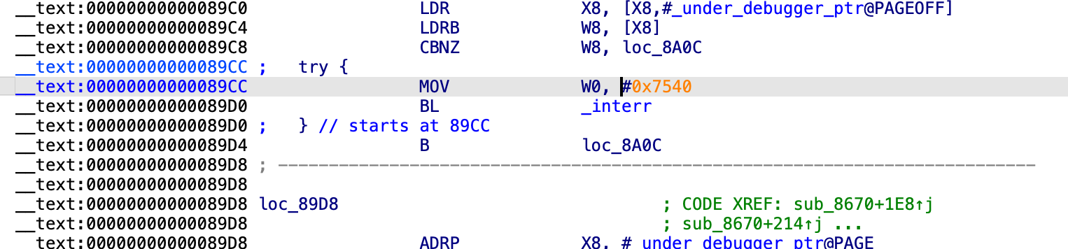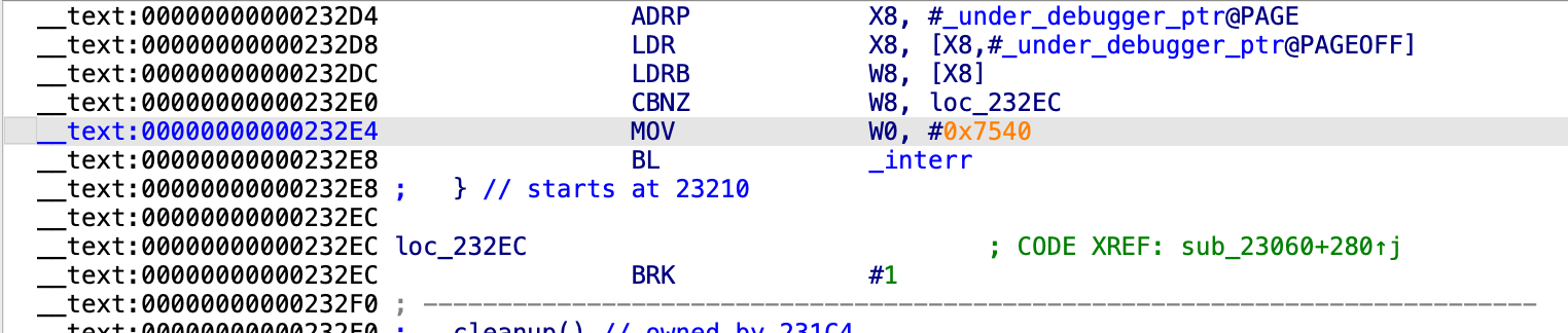 0x232ac开始的指令进行修改,cmp使用的是w8,w8的值我管不着,但x19程序前面都用了,总不可能还等于0吧。于是乎